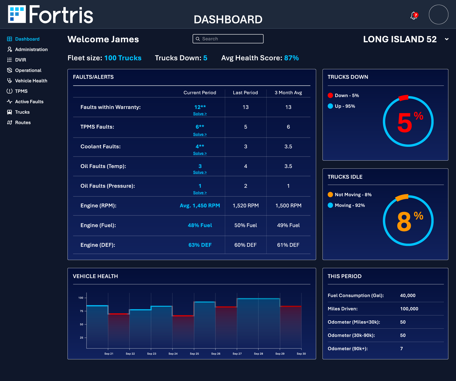 Comprehensive vehicle health monitoring covering engine, transmission, TPMS, fuel, and DEF systems.